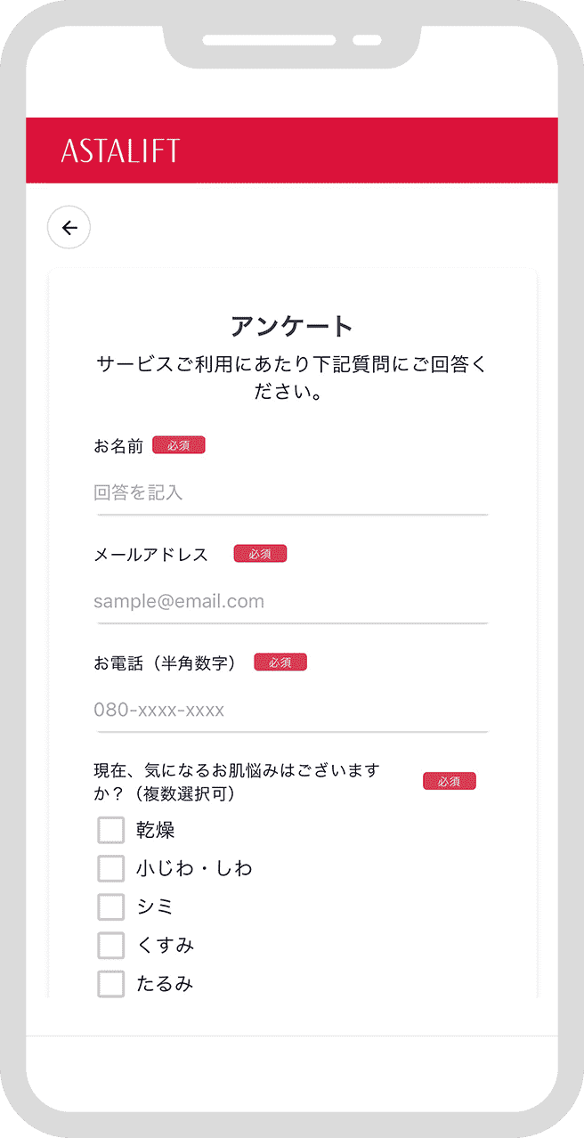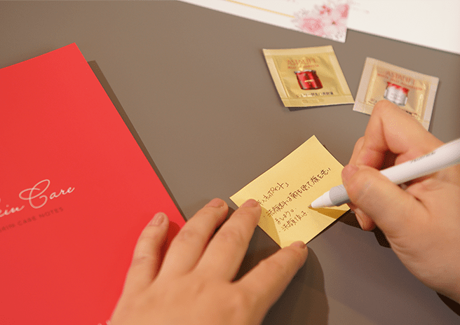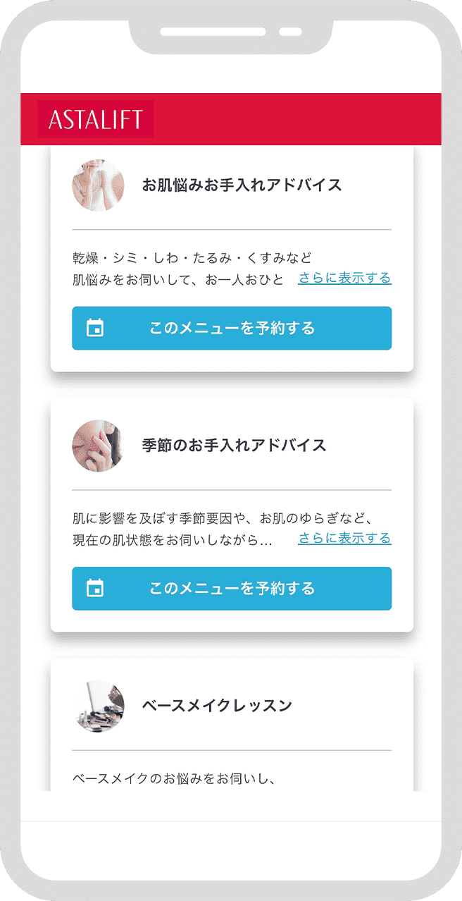 - ・商品販売はしておりません。カウンセリングを通して、お客様に最適なお手入れの提案をさせて頂きます。お客様が商品のご購入を希望される場合は、アスタリフトECサイトで直接購入いただくか、弊社コールセンターよりご連絡を差し上げますのでお電話にて希望商品をお伝えください。