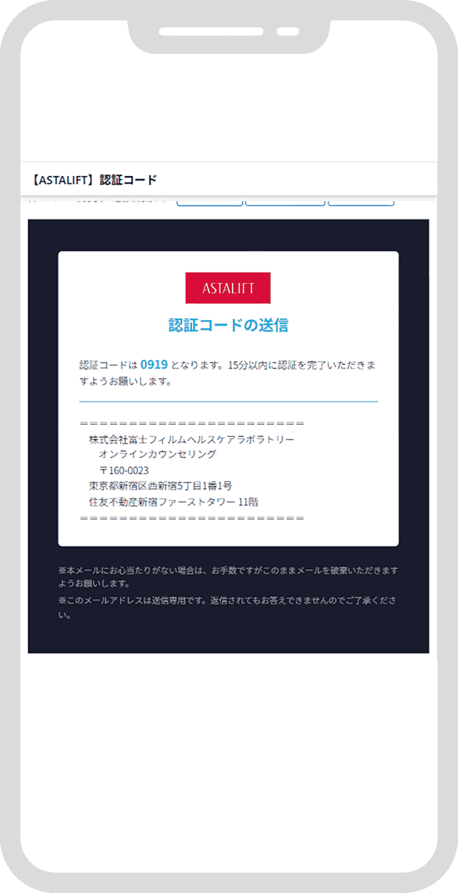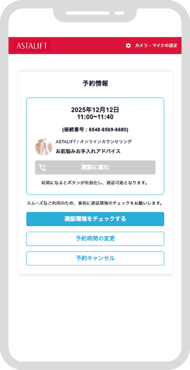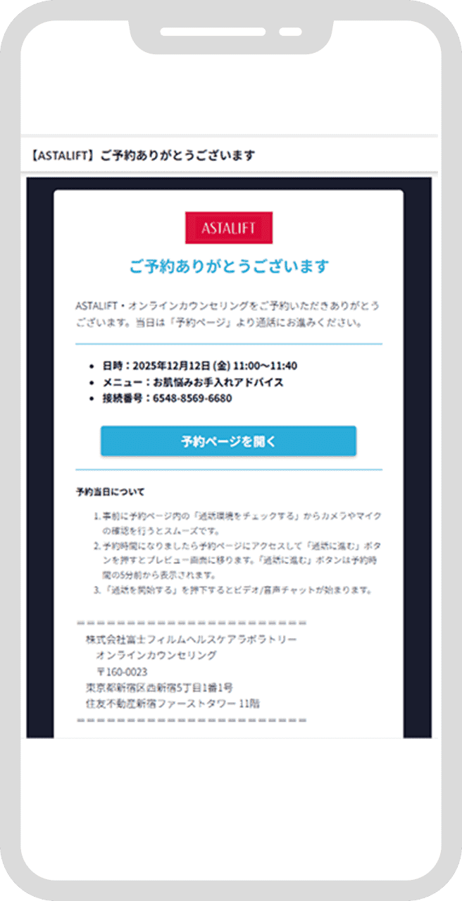「astalift-onlinecounseling@livecall.jp」を受信できるよう設定ください。 - ・ご予約のキャンセルは開始時間の12時間前まで可能です。手続き方法は、予約受付完了メールに記載されたキャンセルURLよりお手続きください。