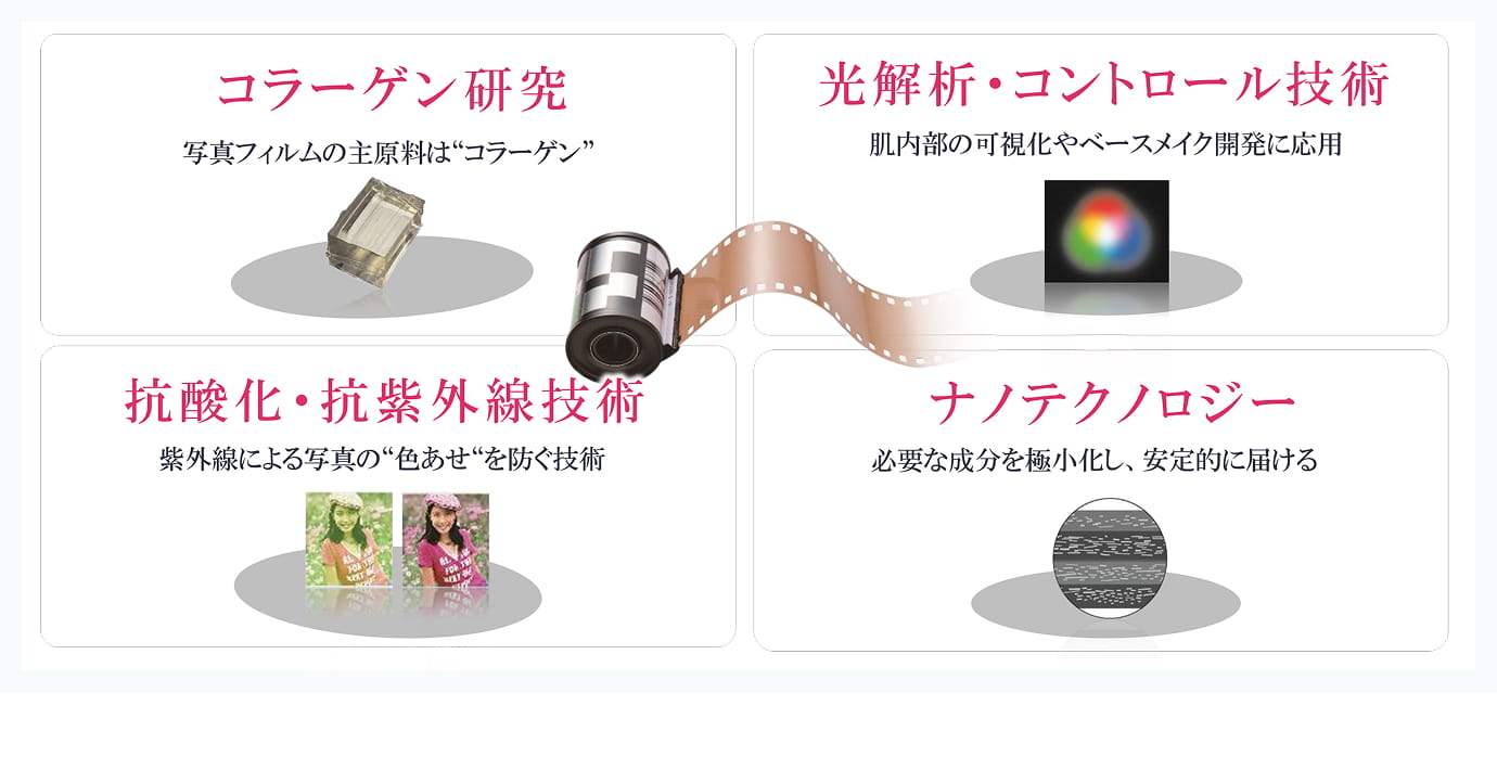 化粧品富士フイルムの化粧品開発のベースは、写真フィルムから生まれた「コラーゲン」「抗酸化」「ナノテクノロジー」「光解析・コントロール」の4つの技術。写真フィルムの素材の約半分を占めるコラーゲンは肌の主成分ですし、シミやシワなどの原因となる酸化現象をコントロールするのが抗酸化技術。ナノテクノロジーは美容成分を高濃度で配合して肌に浸透させるのに活躍し、光解析・コントロール技術は肌内部の様子を可視化するのに役立っています。これらの技術により、一人ひとりの肌悩みに寄り添い、美しさを追求してきた実績が、富士フイルムの化粧品を大きく育ててくれました。